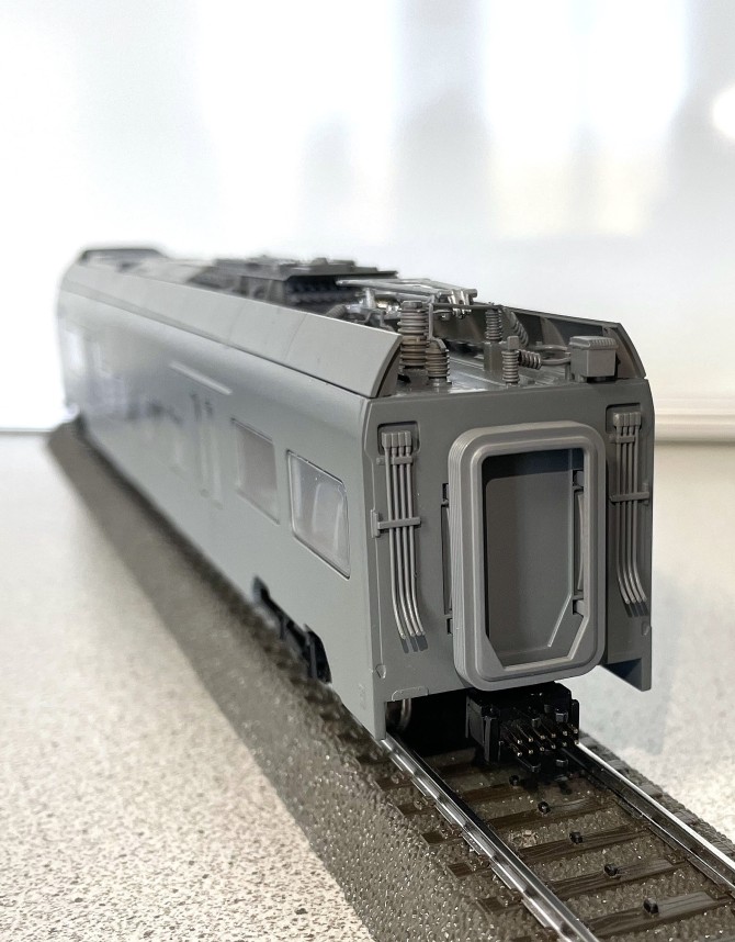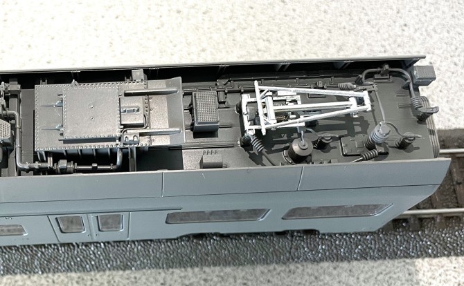 Die speziell für dieses Modell neu entwickelten Pantografen sind äußerst filigran und - selbstredend - vorbildgerecht nachgebildet. Der Dachaufbau mit allen Aggregaten, die Wagenübergänge mit den Faltenbälgen und Verbindungsleitungen und auch der Fahrzeugboden werden hochdetailliert und variantengerecht ausgeführt sein.