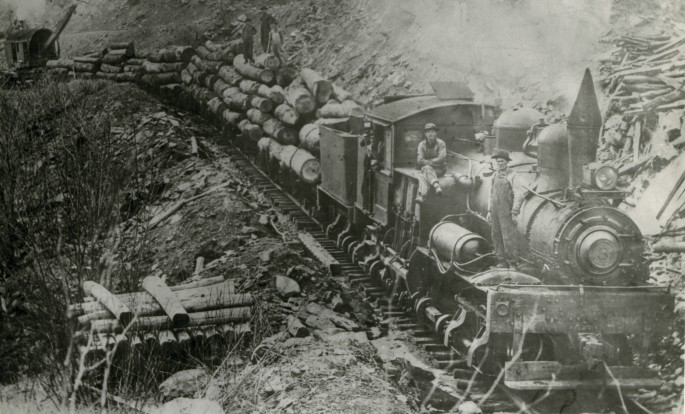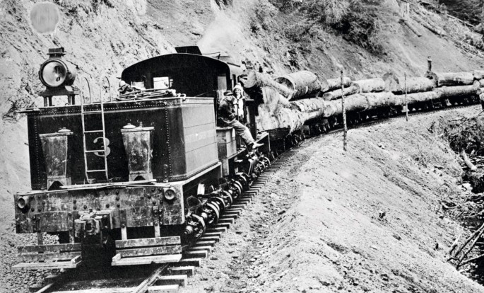 Eine Shay-Lokomotive im typischen Einsatz auf einer engen bergigen Strecke. Copyright: Port Angeles Public Library