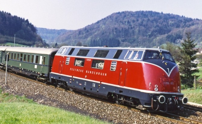 Bild oben: Die Museumslok V200 002 mit einem Sonderzug 1985. Copyright: Will A. Reed / Slg. Eisenbahnstiftung