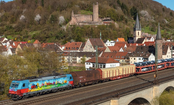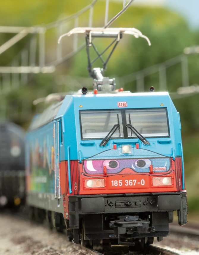 Auf der bunt gestalteten Seitenwand der Lok ist groß zu lesen: "Egal wie gut du fährst - Günni fährt Güter". Vielleicht auch eine kleine Anspielung darauf, dass Güter auf der Schiene immer besser unterwegs sind. Mit den großen Augen auf der Front und den schönen Zeichnungen auf den Seitenwänden der Lok ist diese 185er ein echter Hingucker, sowohl im Vorbild als auch auf der Modellbahn.